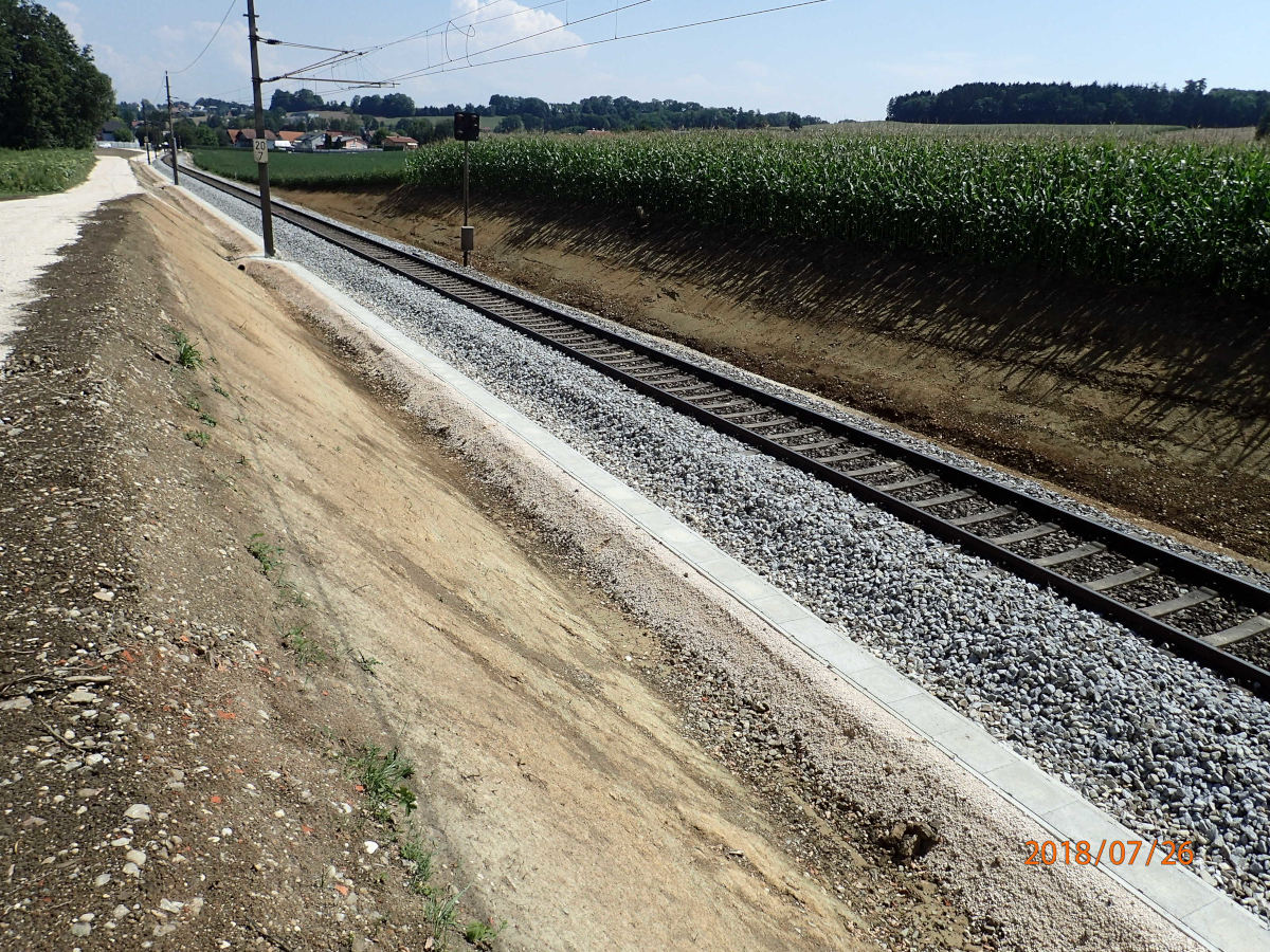 Aufgabe von Umweltbüro Schütz war es, steile Einschnittsböschungen mit hohem Ton- und Schluffanteil mit einer Gesamtfläche von rd. 4.500 m² entlang der Bahntrasse dauerhaft zu begrünen. Die Begrünung erfolgte mit Kokosfasernetzen als Erosionsschutz und einer Hydrosaat. Zudem wurden eine Ersatzaufforstung und ein 420 m langer Wildschutzzaun ausgeführt.